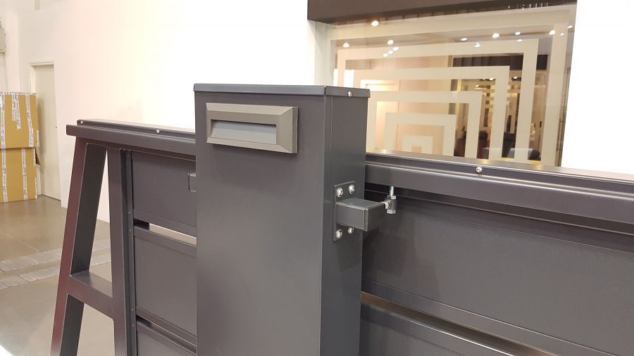 В комплект с откатными воротами поставляются 2 роликовые опоры 2 направляющих ролика, профиль 80×40 мм с врезанным замком, 3 столбами и тормозами, ловителем и ручкой.